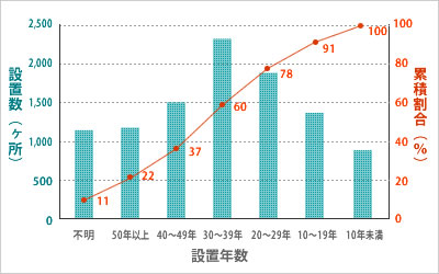 ボンズカジノフリースピン場を含む河川管理施設は、1980年前後に建設ピークがあり、この時期に約2,300ヵ所前後の施設が建設されています。右図の通り、30年以上経過している施設数合計は、全施設数の60%、10年後には約80%、20年後には約90%以上に達します。