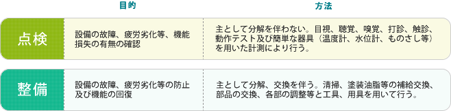 これからは予防保全型に状態監視・傾向管理の要素を取り入れ、維持管理費を抑えることが必要になります。状態監視や傾向管理を行うには、日頃からの点検が必要です。点検には下表の方法があります。