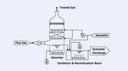 | 海水をボンズカジノ 入金不要ボーナス剤として使用し、排ガス中のSO2を除去します。ボンズカジノ 入金不要ボーナスされたSO2は、曝気により可溶性の硫酸塩に戻された後、海へ放流されます。 | |